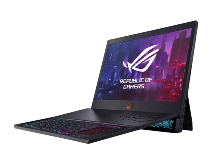 设计方面,ROG 超神X采用了类似微软Surface Pro的设计,机身主体通过铰链支撑,键盘可以拆卸。机身还内置四个喇叭,24bit高保真,192KHz 采样率。键盘键程2.5mm,可以通过有线或无线连接,背光支持神光同步。